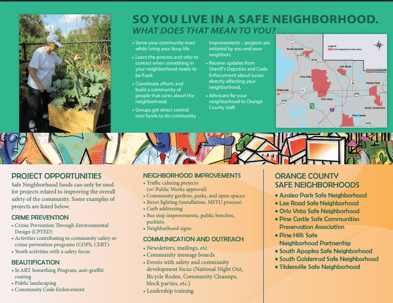 The Safe Neighborhoods Program provides assistance to Orange County’s older and transitioning neighborhoods. It was designed to assist residents in reclaiming their communities from crime, deterioration, and blight. The program partners citizens with the Orange County Sheriff’s Office, Orange County Government, the private sector, community stakeholders, and others to collaboratively preserve and stabilize neighborhoods. Community residents, business owners, and stakeholders will continue to work with Orange County leaders and staff to implement an update to the existing Lee Road Safe Neighborhood Action Plan. The Action Plan provides a profile of the community, demographic information, land use and zoning data, and information about the community’s infrastructure. The plan identifies the community’s core issues and then recommends projects and programs to address them.
