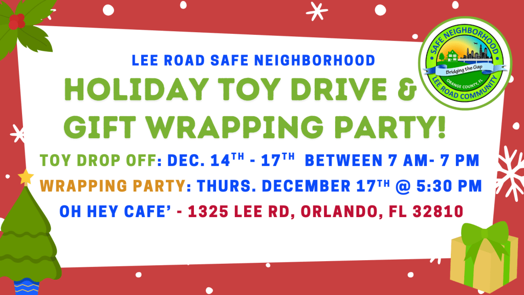 The Lee Road Safe Neighborhood Team is spreading holiday cheer once again through our Annual Toy Drive and Holiday Distribution, held in partnership with the Orange County Mayors’ Toy Drive. This cherished community tradition helps bring joy to children and families experiencing housing insecurity during the holiday season.